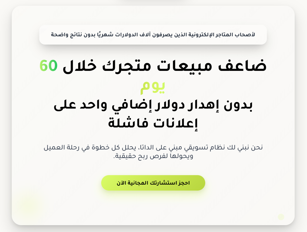 لو تحسبها بالأرقام: مجرد حملة إعلانات متوسطة ممكن تكلفك أكثر من 500$ في أسبوع واحد لكن الصفحة هذه الغير المحسّنة ممكن تضيّع 70% من هالميزانية بدون مبيعات بينما صفحة احترافية منا إن شاء الله تسترد قيمتها من أول حملة.